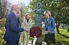 Det var vakkert solskinn i Muséhagen under kransnedleggelsen. Fra venstre: Vitenskapshistoriker og arrangør av jublieumsmarkeringen Magnus Vollset, historieforteller og Armauer Hansens oldebarn Abbi Patrix, ordfører i Bergen Linn Kristin Engø og rektor Margareth Hagen.